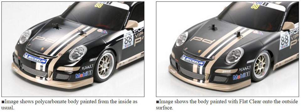 This spray allows the reproduction of a matt-finished body surface on polycarbonate body shell which is adopted on the Porsche 911 GT3 CUP VIP. It is also suitable for reproducing the matt finish on bodies such as the Toyota Land Cruiser 40 and Mercedes-Benz Unimog.